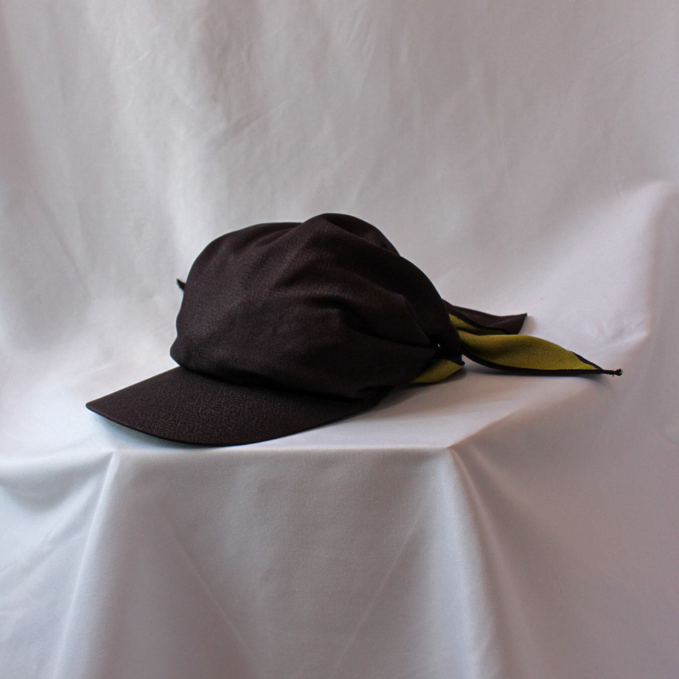 帽子のフレームのない、結んで被るタイプの革新的なキャップスタイル。そんな帽子を風呂敷で仕上げました。