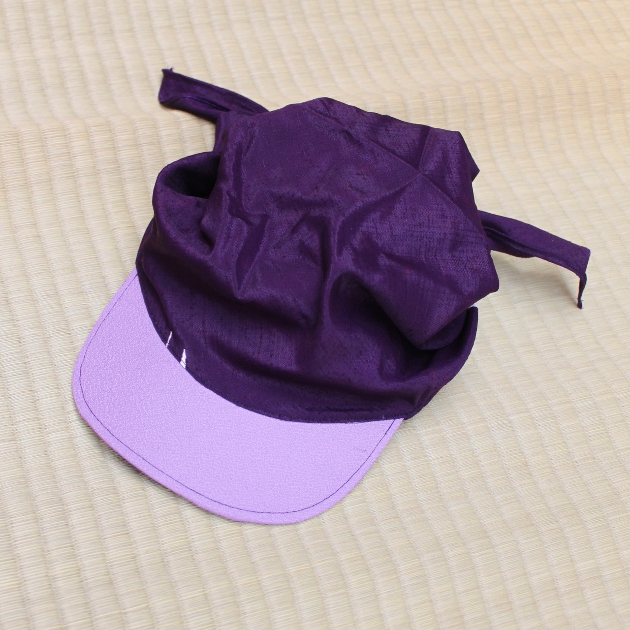 帽子のフレームのない、結んで被るタイプの革新的なキャップスタイル。そんな帽子を風呂敷で仕上げました。
